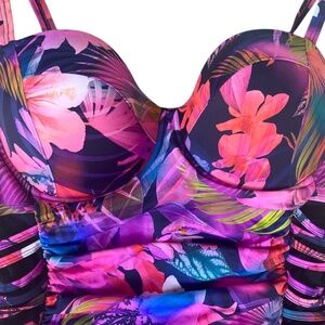 Torrid plus size one piece bathing swimsuit. Size 2 DD/F. Contains underwire and a lattice side. Pretty bright tropical leaves pattern called Multi Leaves. Adjustable straps in back and shoulders. Please see product details in photos. Good condition.