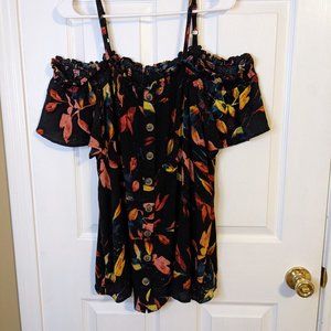 Torrid Smocked Cold-Shoulder Blouse Black Leaf Print details: