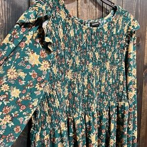 Beautiful Torrid blouse. Size 2 equivalent to 2X. Green with all over floral print. Long balloon sleeves. Ruffle details. Smocked bodice. Stretch material. Flowy hem. Flattering fit. Keyhole back. Preloved. Please see all photos for condition. Great for fall & winter.