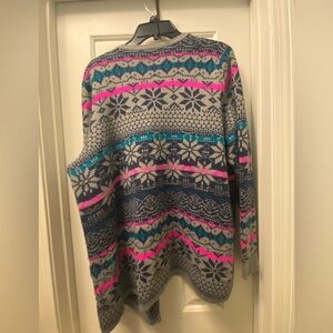 Stay cozy and stylish with this women's gray patterned sweater. Featuring vibrant pink and blue accents, it's perfect for adding a pop of color to your wardrobe.