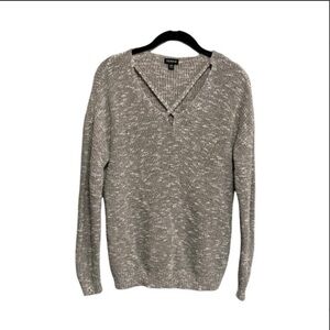 Torrid Strappy Front V-Neck Pullover Sweater. The ivory and black marked knit is the perfect weight, keeping you bundled up without weighing you down. The scorching quality comes from the cleavage-baring crisscrossing strappy v-neck.