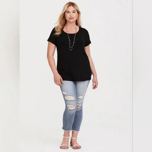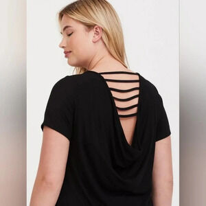 A soft and slinky crew neck tunic has a sexy ladder cutout that exposes just enough skin.