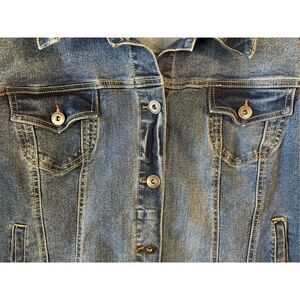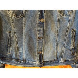Torrid Stretch Denim Distressed Trucker Jacket Size 2X Pockets Long Sleeve Button Up measurements pit to pit 24.5” length 23.5” (0690)