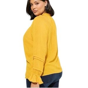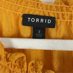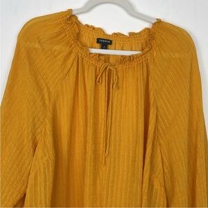 Torrid Stripe Gauze Lace Up Peasant Top. Plus Size 3X. In very good preowned condition. No stains. Color is Mineral Yellow. Lightweight breathable soft fabric. High neckline with front tie detail or untied deep v neck with hook and eye closure. Cinch flounce sleeves and stripe details. Armpit to pit measures 24 inches. Top of shoulder down 29 inches. Comes from a smoke free home.