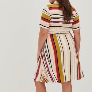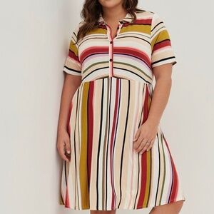 Chic midi dress with bold stripes. Features short sleeves and button detail. Ideal for casual wear.