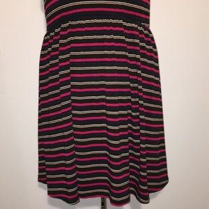 Available for purchase is this dress from Torrid. It is a Torrid size 3, equivalent to a size 22 / 24 or 3X. It measures 40” from shoulder to hem and has a 50” bust unstretched and a 44” waist unstretched, 68” stretched. This dress is a skater style with a higher neck than usual. It has an elastic waist and is sleeveless. This dress features a crossover open back. It is black jersey with magenta, pink, white and navy horizontal stripes. This stretchy dress is new with the original tag.