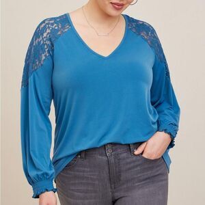 Torrid Studio Knit Lace Shoulder Peasant Blue Top Blouse Sz 6X. Excellent used condition no holes no stains. Smoke free home. 29 inch bust and 31 inch length. Bin 8
