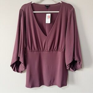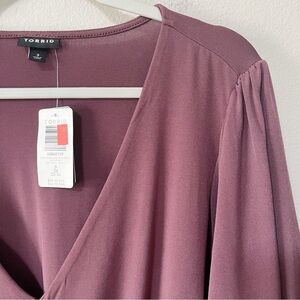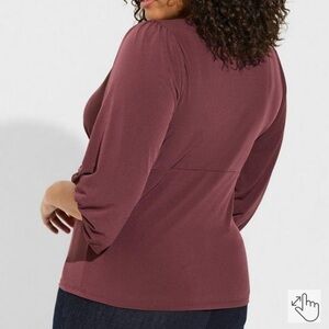 Brand new with tags Torrid Studio Knit V-Neck Quarter Sleeve Shirred Top in Sassafras (a maroon/burgundy color). Plus size 3 = 3X. NWT- writing on interior care tag.
