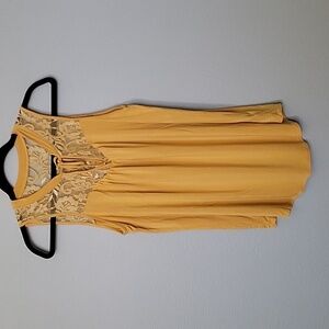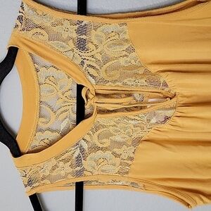 Gorgeous deep butter yellow color. Very soft and stretchy fabric. Ties at the neck or can be worn untied. Lace at the upper chest and goes around back. Good condition. Spring, summer, brunch, comfy, casual, weekend, hanging out, festival, romantic, girly, sweet, twee, dainty.