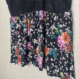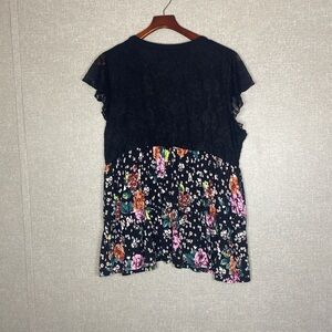 Torrid Super Soft Lace Cap Sleeve Pop over Top Torrid Size 2 (18-20) EUC Really cute black lace top empire waist with pink floral bottom. Shear lace cap sleeve, V-neck, Button up front Flat lay measured pit to pit 21” Body length from shoulder to hem 28”