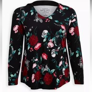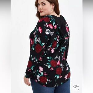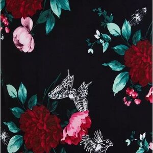 SUPER cute!! Red, burgundy, fuchsia, pink, mauve, lavender, green, and white print of flowers, skulls, moths, snakes, and ravens on jet black hooded scoop neck long sleeve tee. Hood fully lined in black, no ties. NWT size 3X.