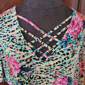Torrid Super Soft Knit Top V-Neck Floral & Animal Print Criss-Cross Detail Size