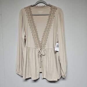 Torrid Super Soft Tie Front Blouse Cardigan Ribbed Lace Quiet Luxury Cream Taupe