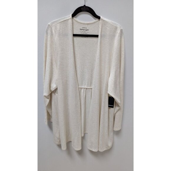 Torrid Supersoft Plus Winter White Cardigan. Size Torrid 4 (4X). New with tags, with some very minor wear to the material from storage. It is very soft with long sleeves, a longer length, an open-front style, and elastic detailing to the back.