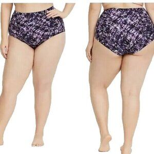 Torrid high waist ruched bikini bottom with built in slimming mesh in purple and black tie dye print, size 1X. New without tags, hygienic liner intact, no noted flaws.