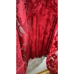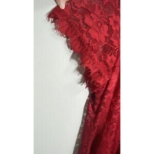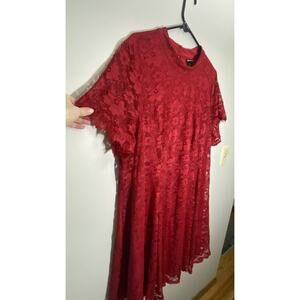 This is a Torrid A-line dress in size 3XL, perfect for parties and cocktail events. The dress has a high neckline and short cap sleeves, with a solid red color and a lace overlay made of a stretchy rayon blend material. It features a button closure and falls to knee length. The dress is lined and has a fit and flare style, making it comfortable and flattering. The dress has a romantic and classic theme, suitable for any season.