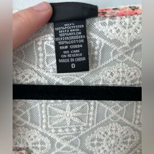Features: ivory lace inset, flowy, floral print, sheer, lightweight and breezy
