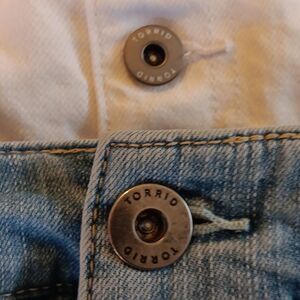 TWO Pairs of shorts. One blue denim and one white denim. Content is the same, a little stretch. Both size 22 . Blue measures 42 at waist, 48 at hips. 12 inch rise, 7 inch inseam. White. Slightly distressed. 43 at waist, 52 at hips. 13 inch rise, 3 inch inseam. Both 5 pocket classic.