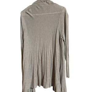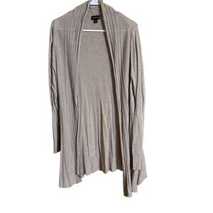 This tan cardigan from Torrid features a lightweight, open front design with cascading panels for a relaxed and elegant look. The fine knit texture and elongated length make it perfect for layering over various outfits, offering both style and comfort.