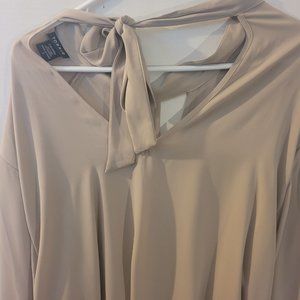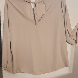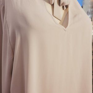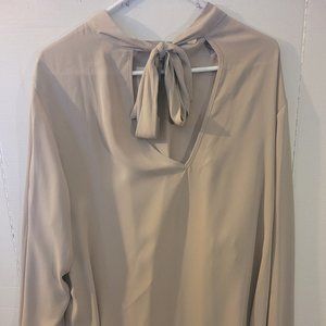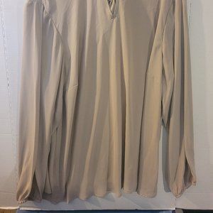 Tan blouse with V neck. Keyhole on back with tie. Elastic cuffs.