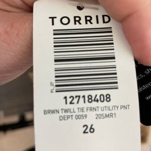 Torrid tan utility capri pants in size 26. Missing tie to tie pants inside. Does not affect wear. New with tags. Cotton 34%, modal 33%, polyester 31%, spandex 2%, machine wash.