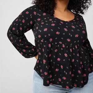 Torrid Top 2X Black Floral Tee Long Sleeve Tiered Plus Size Babydoll V-Neck NWT