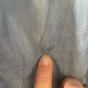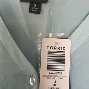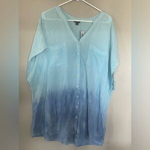 Torrid blouse/top, Tags still in place and never worn, size 3X. Light blue to dark blue ombré. Has 2 front/chest pockets, buttons up the front. There is a small hole in the lower back (see photo). 100% Rayon, lightweight material.