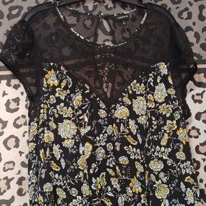 Floral and lace trapeze dress with cap sleeve and button accent on the back. Above knee length. Black, yellow, green and baby blue floral pattern. Mesh lace trim on the bottom of the skirt. The lace is not stretchy so the arm holes are pretty set.