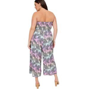 Beautiful tropical strapless jumpsuit in airy crepe fabric. Elastic smocked top and wide-leg cropped pants bottom. Has pockets! Dress up, dress down or even wear as a bathing suit coverup. Pattern is Pretty Summer Leaves in Black. Torrid size 2 / Plus size 2X (18-20). New without tags, NEVER WORN!