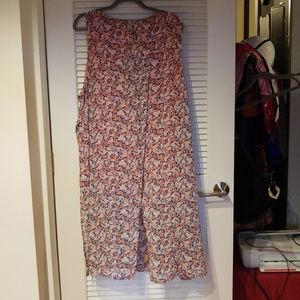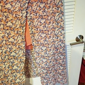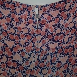 This is one of the most beautiful and Unique tops I have in my closet. It has a a slit in the back wich shows a peach shirt underneath. It also has slits up both sides and a keyhole button in the back. So much detail. It goes below the knees and looks awesome with leggings. There is some wear in the arm area and some loose strings on the inside but are not visible when wearing it. The colors are navy blue, peach, pink and cream.