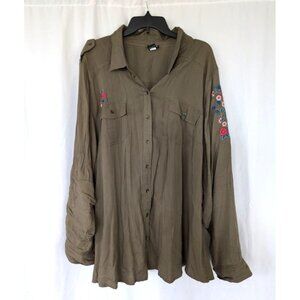 Torrid Tunic Blouse Womens Size 4 Floral Embroidered Roll Tab Sleeve Flowy Green