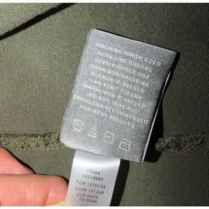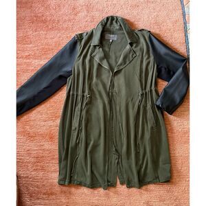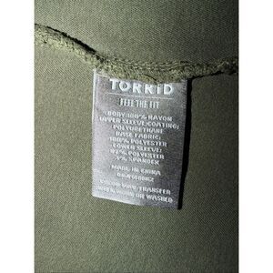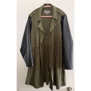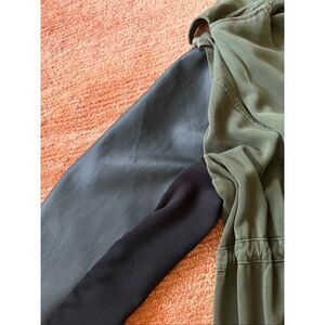Torrid twill anorak jacket in olive green with black faux leather sleeves and adjustable drawstring waist. Lightweight utility style with functional pockets. Fabric content: body 100% rayon, upper sleeves polyurethane with polyester backing, lower sleeves 97% polyester 3% spandex. Please refer to photos for fit and details.