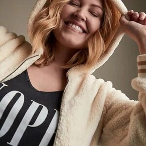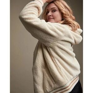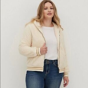 Torrid Varsity Bomber Hooded Full Zip Jacket Sherpa Ivory Sz 3
