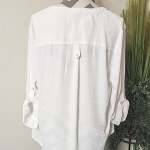 This white blouse from Torrid features a relaxed fit with 3/4 sleeves and a stylish mandarin collar, making it a versatile addition to any wardrobe.