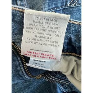 Medium wash, Stretchy. Distressed, 5 pocket style. Zip and button closure with beltloops.