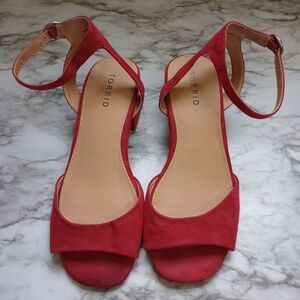 Torrid wine color faux suede block kitten heel sandals women's size 7W. Pre owned