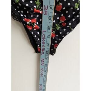 The Torrid Women's Bodysuit in size 2XL features a cherry print design in black color, with a retro theme. Made of polyester blend material, this one-piece bodysuit has lace trim and adjustable straps for a comfortable fit. The mild compression area is perfect for providing support and shaping, making it a stylish and functional addition to any woman's wardrobe.
