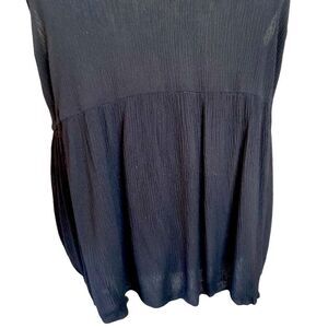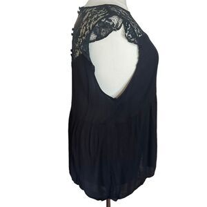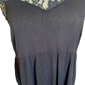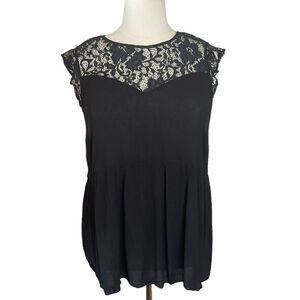 Torrid Woman's Sleeveless Blouse size 4X Lace Yokes Short Lace Flutter Sleeves. Back and Front lace yokes. Back yoke has covered black buttons with loop closure. The fabric of the blouse has a crepe look to it. Elastic waist. NWOT. Still has the plastic tag attachment, but tags are gone.