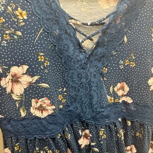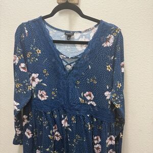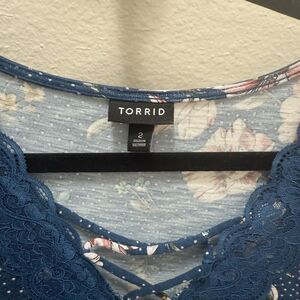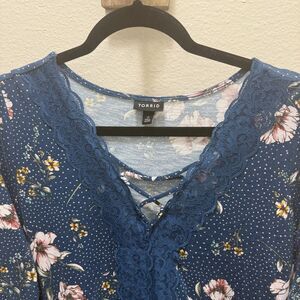 Torrid Women Floral V-Neck Blouse Blue Sz 2 Long Sleeve Lightweight Lace Detail