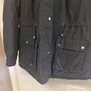 Gently preloved. No stains or flaws. Hooded with removable fur trim inside is combination or quilting and fur drawcord at waist zip and snap closure two exterior snap closure pockets zippered pocket on sleeve Polyester /Nylon Have a question? Please do not hesitate to ask. All items ship from smoke free and pet free home. All offers will be reviewed and responded to. Thanks for looking. Please check out the other items in my closet. :)