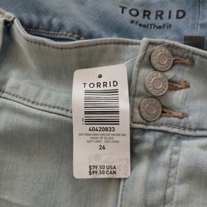 These Torrid Cropped Jegging Super Soft pants are in size 26 with a light blue distressed denim fabric. They feature a 3 button & zipper closure, a mid-rise fit, and a 5-pocket design. The jeggings have a cropped length of 20 inches and are designed for comfort with stretch fabric. Perfect for summer, fall, or spring, these pants have a modern American theme and are machine washable.