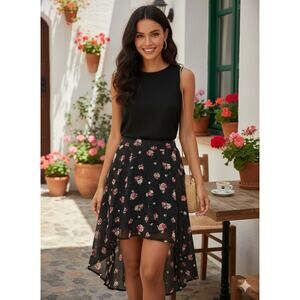 Float through any occasion in this beautiful and whimsical high-low skirt from Torrid. This piece features a playful yet romantic mix of classic polka dots and a vibrant floral print on a sheer chiffon overlay. The dramatic high-low hemline creates beautiful movement, while the shorter inner lining provides perfect coverage.