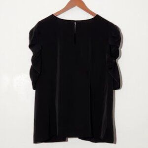 The Torrid Women's 3/4 Ruffle Sleeve Blouse in size 2X is a stylish and versatile top suitable for various occasions such as weddings, parties, or business events. Made of lightweight polyester material, this black blouse features a solid pattern with a round neckline and 3/4 sleeves. The pullover closure and regular fit make it easy to care for and comfortable to wear throughout all seasons. With a Bohemian, peasant, or city theme, this blouse with a keyhole neck adds a touch of charm and elegance to any outfit.