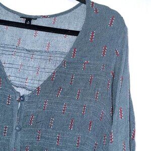 Lightweight and breathable blouse made of 100% cotton. Features a charming peasant style with a button front and delicate red patterns.