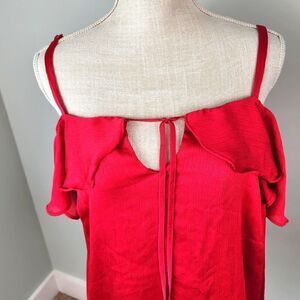 Torrid women's top. Size 00 which is M/L. Pullover. Adjustable spagetti straps. Ruffle in front with Keyhole loop. Lined. Polyester. Like new with no stains or tears.