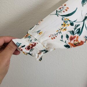 Torrid women's babydoll style tunic top - allover floral print pattern, ruffle trim neck, smocked cuffs, drawcord waist and split V-neckline. White.