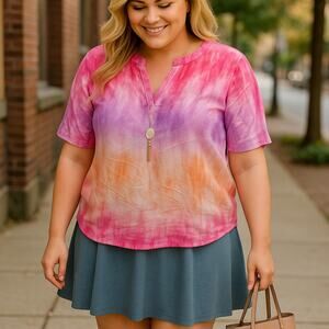 Torrid Women's Blouse 2 2X Pink Purple Orange Ombre Tie Dye Georgette Camp Shirt