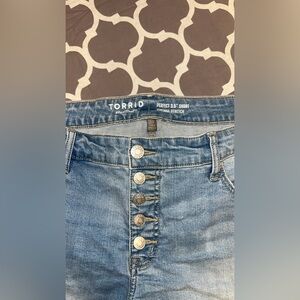 These Torrid jean shorts feature a stylish distressed design with a soft, faded blue hue. The cut-off hem adds a relaxed, casual vibe, making them perfect for everyday wear.