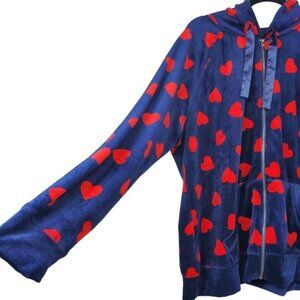 Torrid long sleeve heart print velour full zip lounge hoodie in red and blue. Long sleeves. Front zip closure. Hooded. Pockets. No stains or holes. Casual spring fall winter velour hoodie.