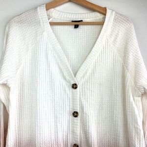 This waffle-knit tunic features a beautiful dip-dye V-neck, button front, and a shirttail hem. Brushed waffle knit fabric V-neck Long raglan sleeves. It looks like a cardigan but the buttons in front are just for look. They are not functional. Super soft material.